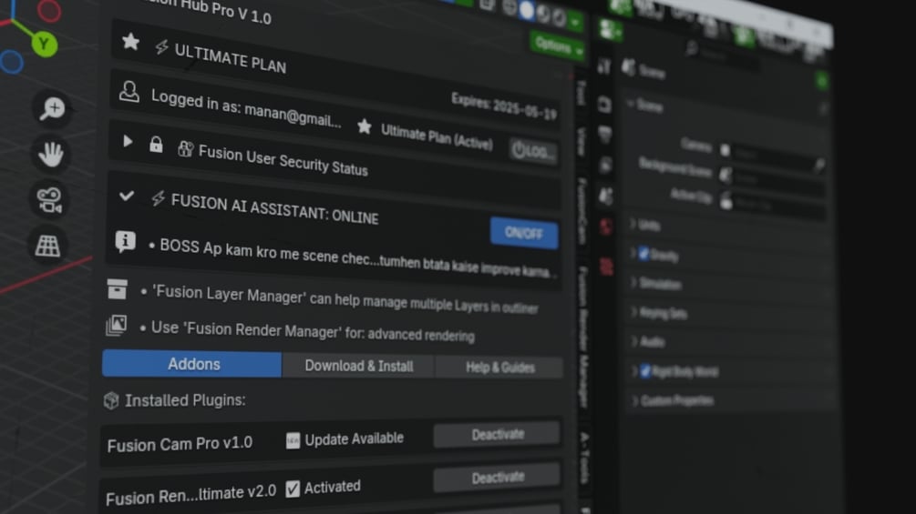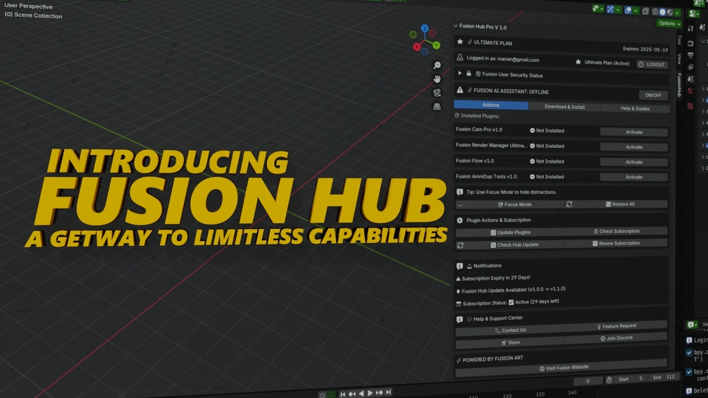 Fusion Hub Plus is a comprehensive control center for managing professional Blender workflows. Developed by Fusion Art Studios, it acts as a central hub to install, manage, update, and verify Blender addons — all with an intelligent licensing and subscription system.